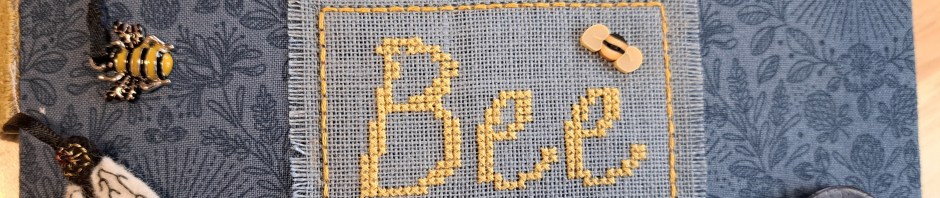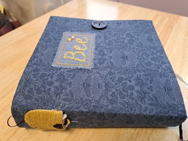 I mulled over the name of the bee book for quite a while, I did quite like ‘A Bee Compendium’, with its ABC, but with compendium being such a long word, I couldn’t get it to work. In The end I kept it simple with ‘Bee’. I found a cross-stitch font I liked on Etsy and stitched it on a blue linen. The tiny bee button which I’ve had in my stash for ages worked perfectly.