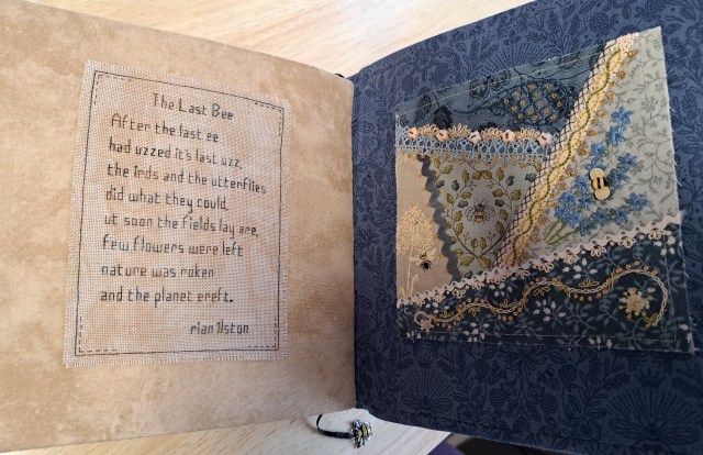 What a stunning piece of work. I particularly like the double spread, doily page and obviously the goldwork bee! The bee page marker is an inspiration. So love this!