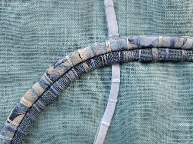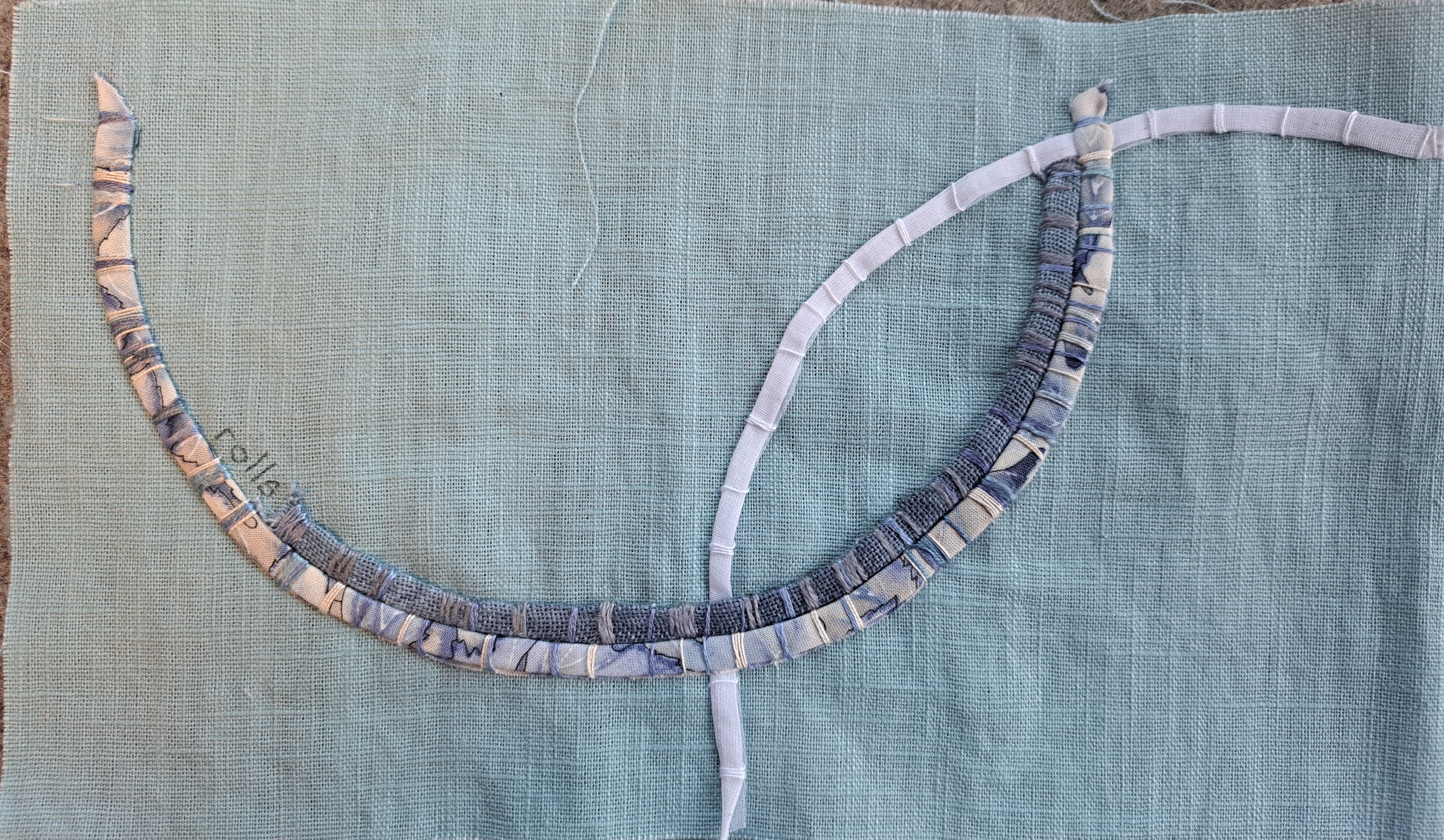 Week 3 word was rolls. For this Anne made narrow rolls of fabric and then couched them down with a variety of threads. She did quite long lines which help to break up the big circle of linen. As well as putting mine in a book, I’m also having a loose theme of circles. I tried cutting my first roll on the bias, thinking it would take the curve better…it might have done but it was awfully fiddly! I used a leafy quilting cotton for that one. I’m trying to use a variety of fabrics and threads, so I then made a roll from a crisp cotton gauze and another from some even-weave linen.