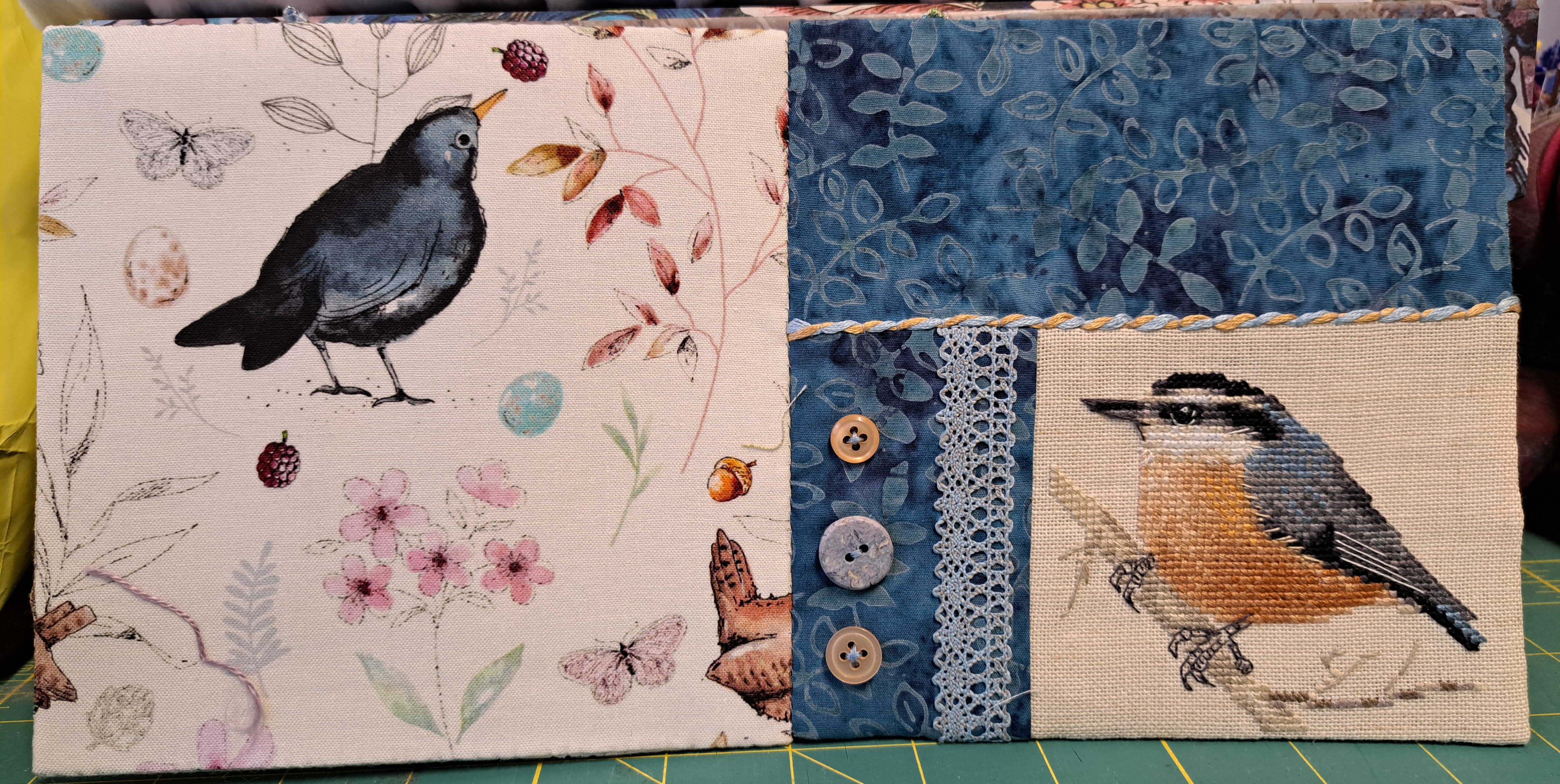 After the kookaburra is a blackbird print from some dress-making fabric I’ve earmarked for a shirt which colour-wise picked up the colours of the cross-stitch nuthatch nicely. This one is also a former mini-cushion…