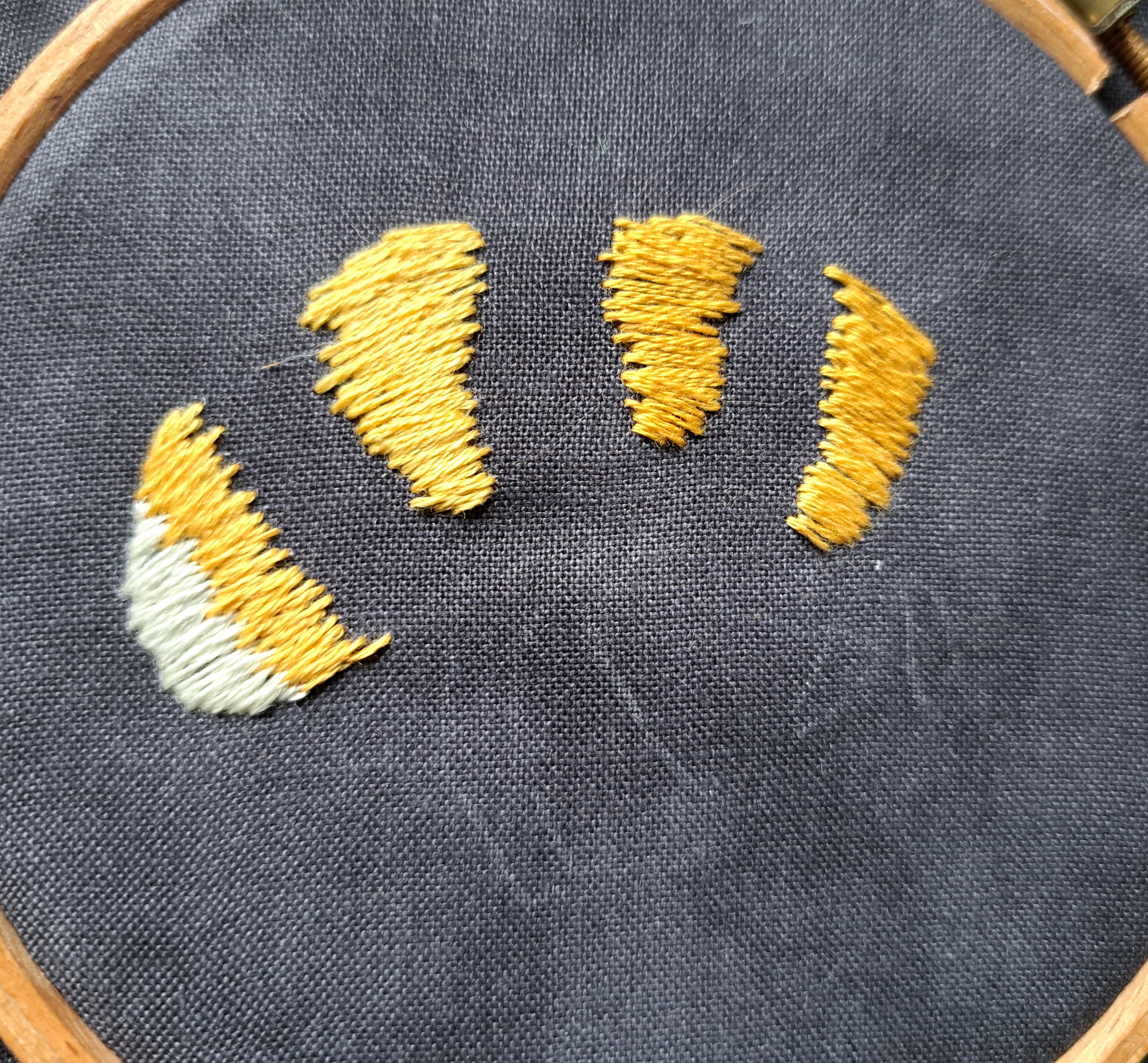 I’d already stitched the background of flowers on a honey coloured background. The bee is stitched on the black(ish) background which does help getting the density of colour. Once the stitching is finished it’s then cut out and appliqued on. Rachel, the designer, stitched the legs at this point too but they did prove fiddly to then cut out and turn under so I decided to just applique the body and then add the legs once it was stitched on the background.