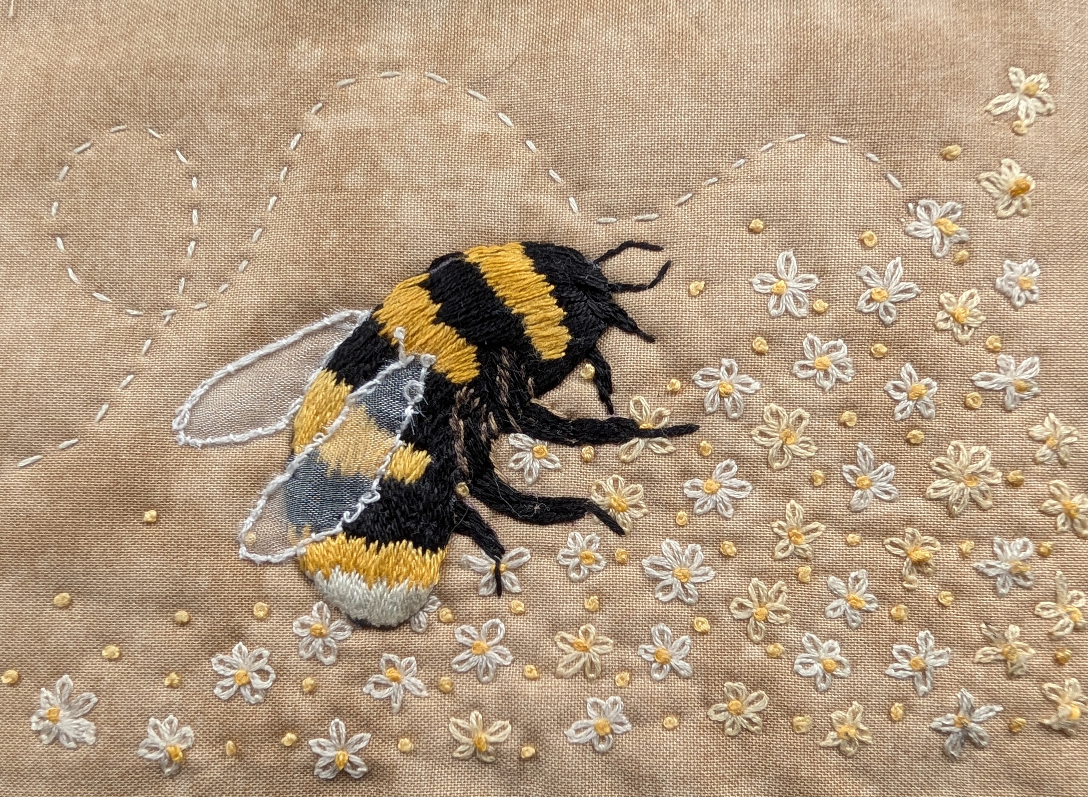 Three weeks ago I’d finished my wren and I’d started stitching a bee…