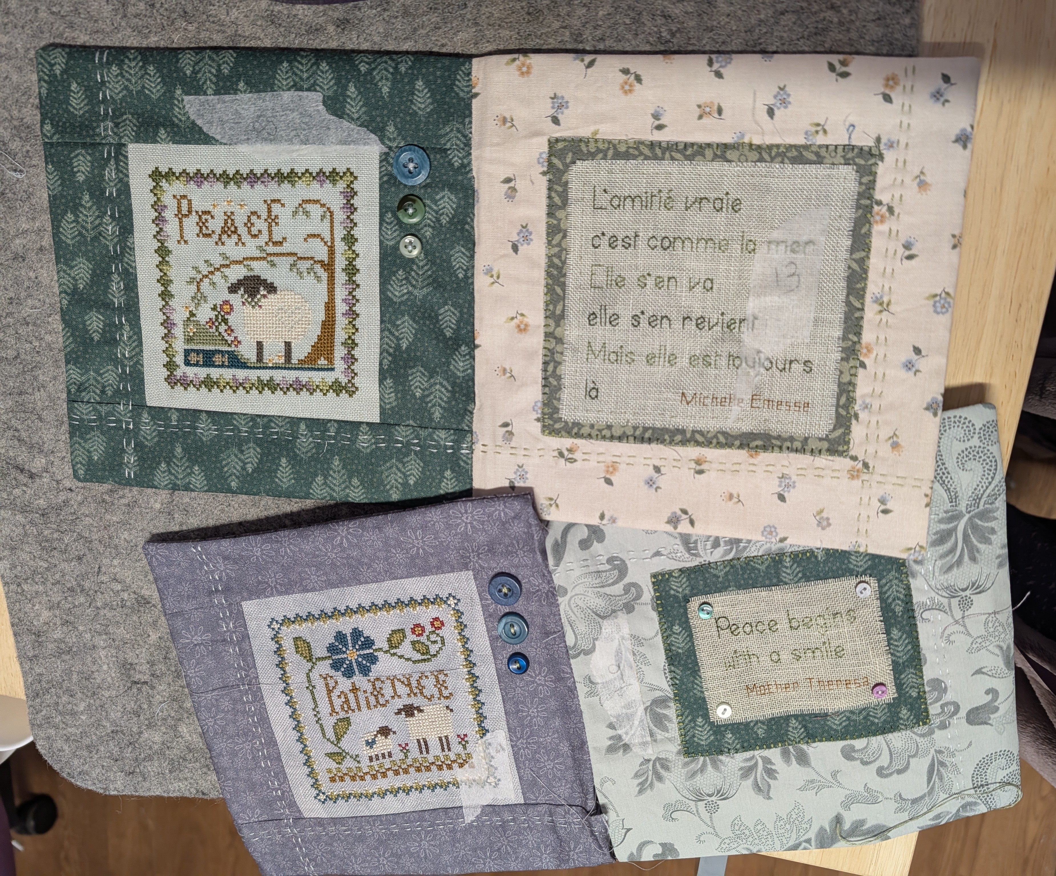 In my last post I shared the finished pages of cross-stitch, a mixture of Little Sheep Virtues, some with apt quotes along side, and some of the Sew Together series…