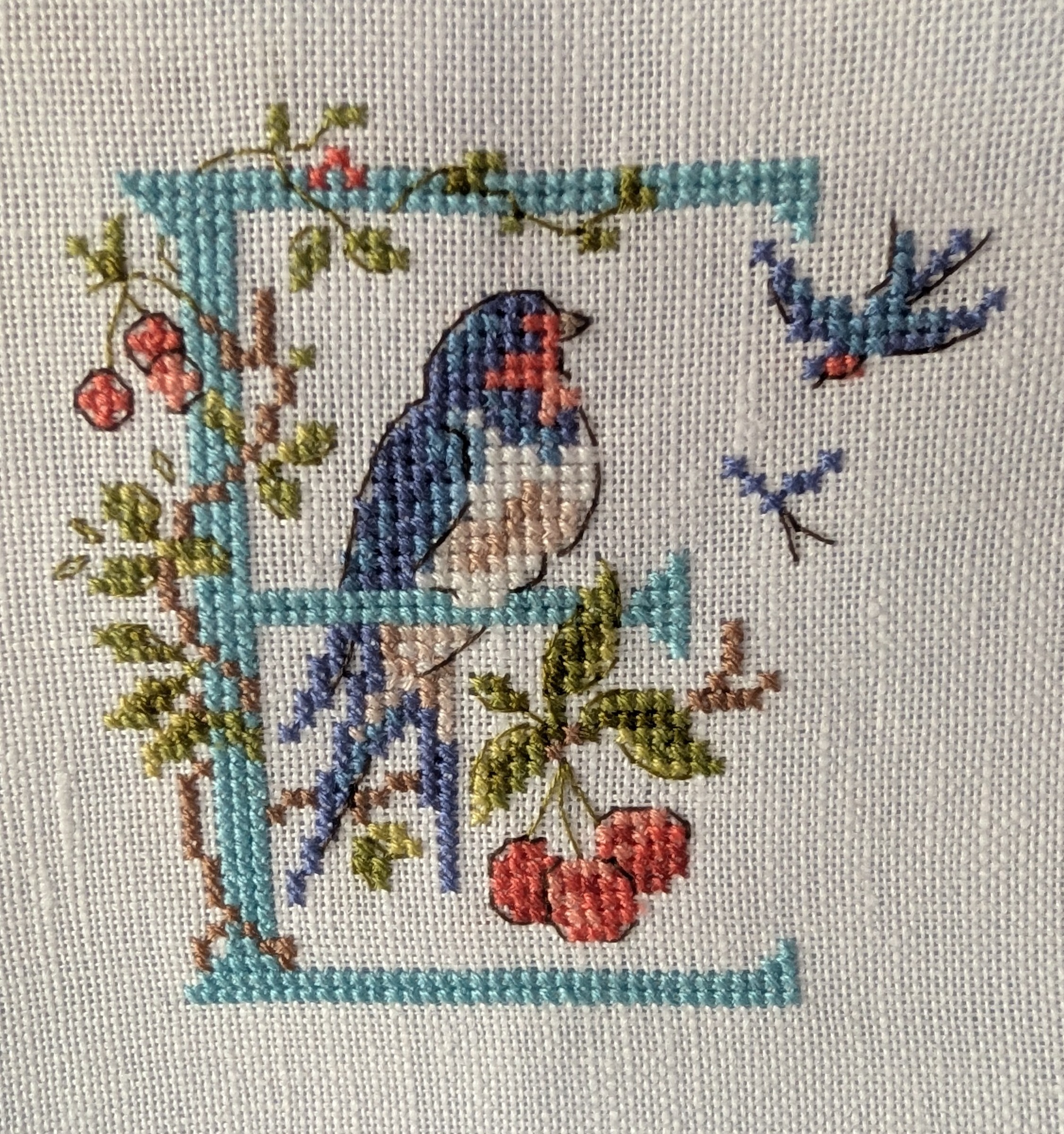 I’ve also stitched the letter E which has a gorgeous swallow sitting on the letter. Seeing the first swallow of the year is a good sign that summer is well on the way. Many swallows migrate all the way the South Africa for the winter.