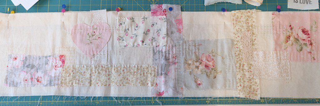 I gathered some pretty cotton pieces from my scrap box and started laying them on the strip. I’ve decided to use some cross-stitch and embroidery pieces I’ve done over the years, some have gone onto cards, others made into mini cushions. I played about for a while with the fabric and the embroideries, in the end I’ve one side more muted than the other, one will have more pink, softer embroideries, the other will have the red hearts and darker pieces. Some fabrics I’ve used twice as they were too strong for the muted side but I realised the wrong side was still pretty, so some are upside down.