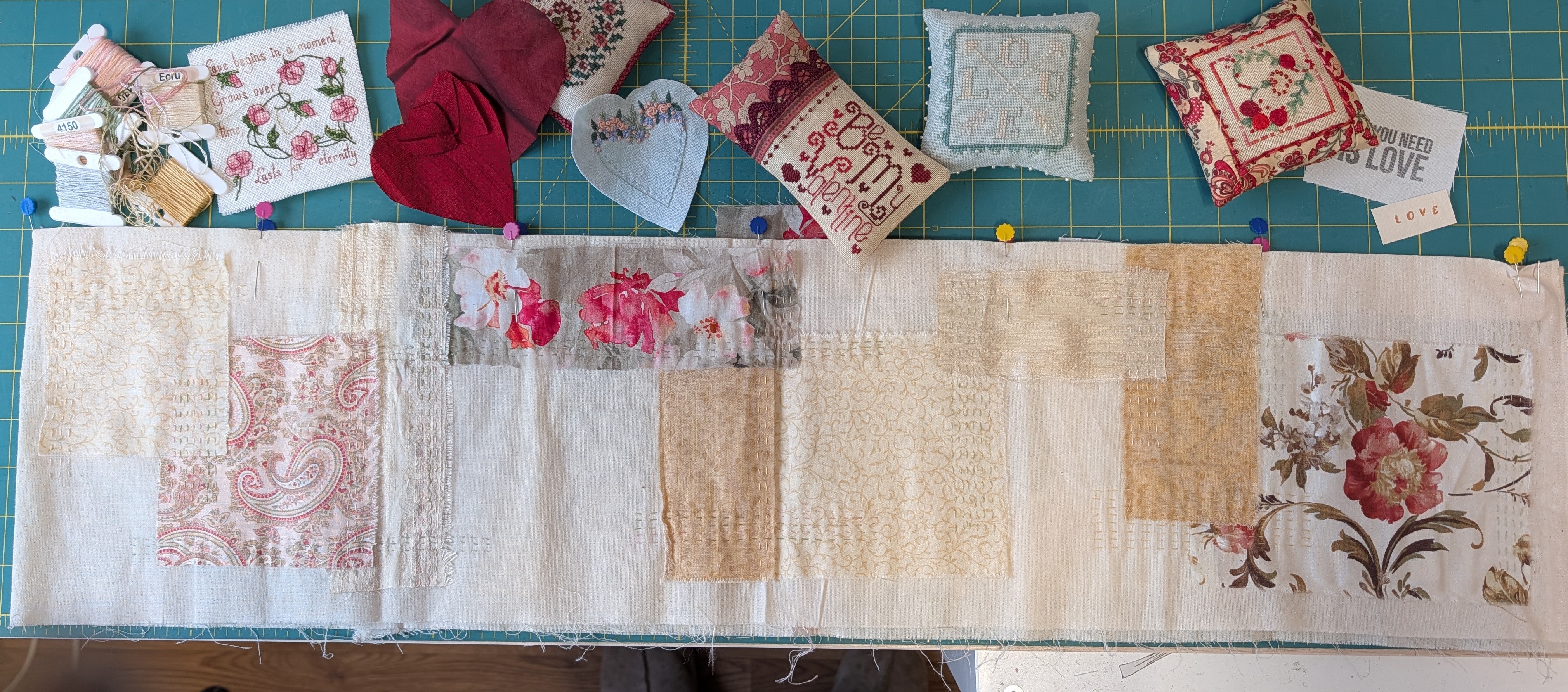 I gathered some pretty cotton pieces from my scrap box and started laying them on the strip. I’ve decided to use some cross-stitch and embroidery pieces I’ve done over the years, some have gone onto cards, others made into mini cushions. I played about for a while with the fabric and the embroideries, in the end I’ve one side more muted than the other, one will have more pink, softer embroideries, the other will have the red hearts and darker pieces. Some fabrics I’ve used twice as they were too strong for the muted side but I realised the wrong side was still pretty, so some are upside down.