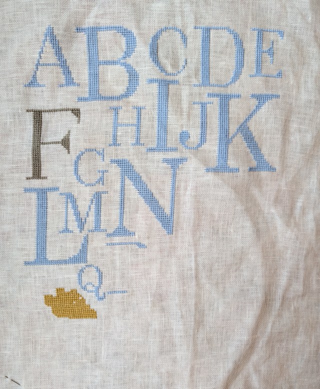 I had to make a bit of an alteration to the design. The letters are all in blue apart from my grandson’s initial. At the bottom it will then say ‘ …is for Frankie’. Of course the letter F was the smallest of the alphabet, with a big G next to it. I redrew the F and G and I think it works OK, the gap above the G will have some little star stitches as fillers so it won’t be left empty.