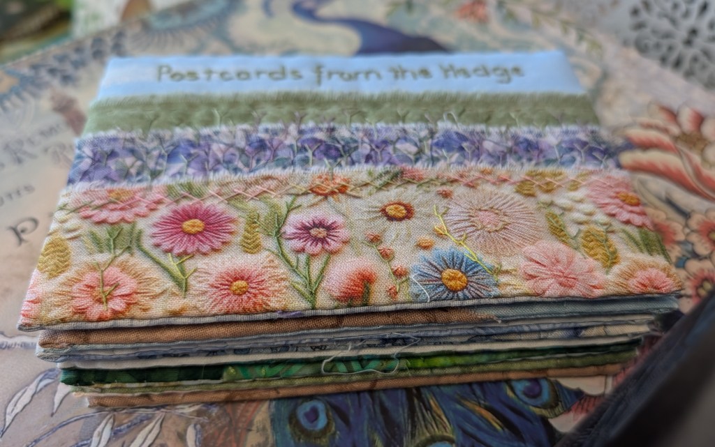 In the end I abandoned that idea and decided to just choose a co-ordinating fabric. I’m pleased with that plan as it doesn’t distract from the stitching. I cut some pelmet vilene to size, pressed the back and front round it and slip-stitched them together. I’ve got a neat pile of pages finished…