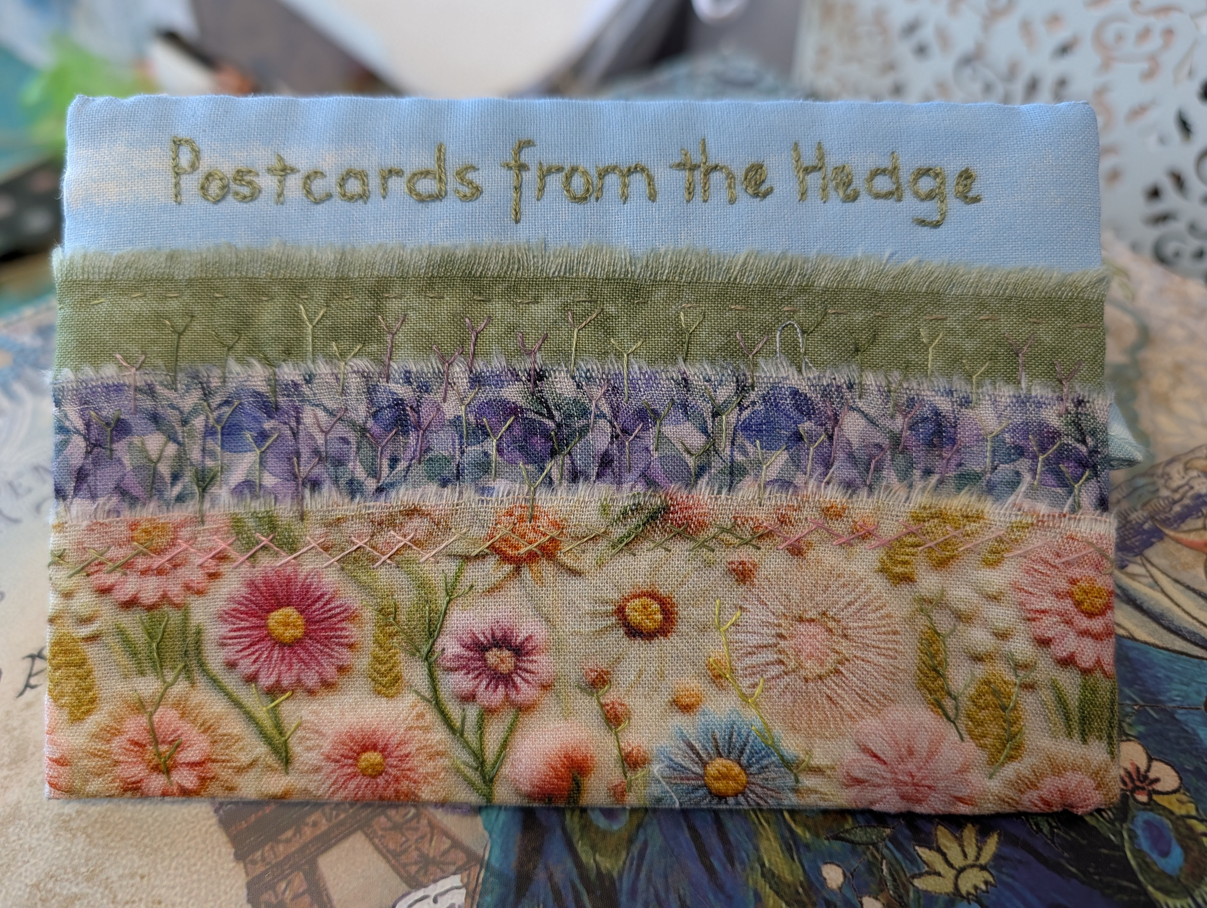 The page on the top I stitched yesterday. I wanted a title page and couldn’t decide what to use. I then thought of a kit my friend gave me for my birthday. It had lots of strips of fabric and some calico with sky painted at the top with the idea that you made a landscape. I had a play with the strips, swopped some of my own in and then started stitching. I’ve kept it fairly simple with fly stitch, herringbone and feather-stitch mainly. I embroidered the title with a tiny chain stitch using one thread of DMC. I’m happy with it though I still can’t decide if it looks like a hedge bottom with the layers of flowers (which was my idea) or a hedge at the bottom of a field of flowers! Either way, I’m happy with it.