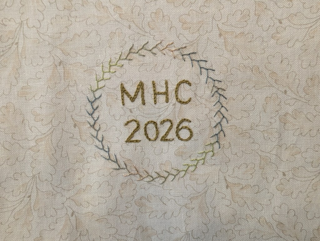 The last piece of stitching I needed was my initials and the date. I chose some oak-leaf fabric from my scrap box, I love this fabric, you know you get some fabrics which if you saw again, you’d buy lots, this is one of mine! I wrote my initials and the date with a Frixion pen, added two circles around it and chose a soft green thread for the letters and a variegated thread for the ring. I stitched the letters and numbers with chain-stitch again, I do like chain stitch for letters, it creates nice curves and you can do them surprisingly small. To give you an idea of size these are about 3/8th” tall and stitched with a single DMC thread. The outer circle is feather stitch, having a double ring drawn helped me keep it neat.