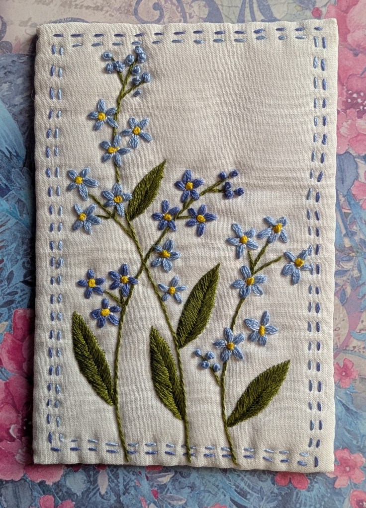These designs are all from Featherstitch House, Rebecca, the designer, was doing a year long project of postcard sized embroideries releasing one design each week. I haven’t stitched many but they have all been a delight. One more on my to-do list was some forget-me-nots. This was stitched on a simple plain background. I enjoyed stitching this one, I used stem stitch, fishbone stitch for the leaves and another stitch for the petals which I can’t remember the name of but it was basically doing lots of straight stitches through the same holes but arranging them to each side. There’s a colonial knot in the middle of each one and I remembered too late that there’s meant to be a tiny black French knot in the middle of each colonial knot too! The buds are chunky French knots.