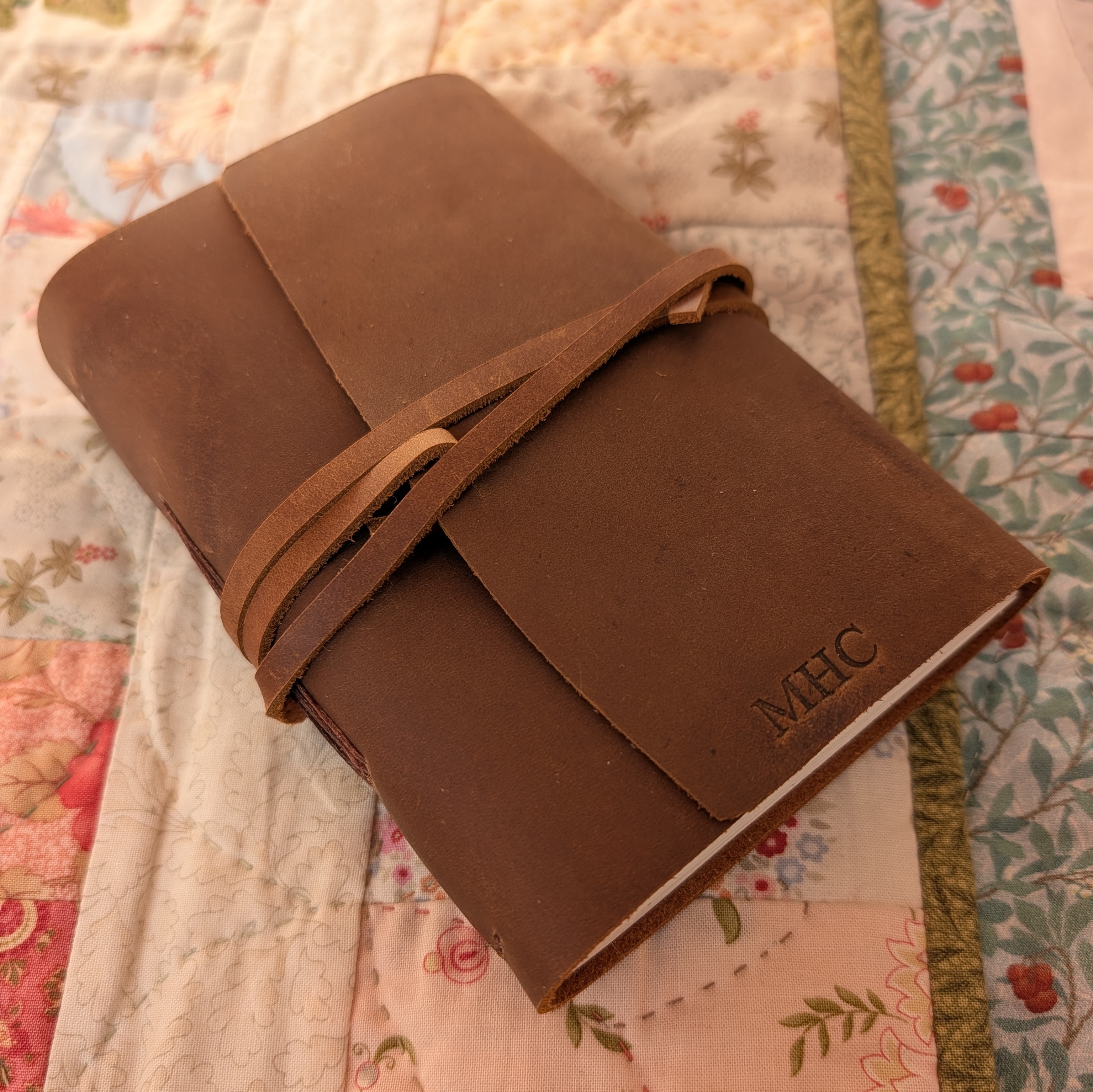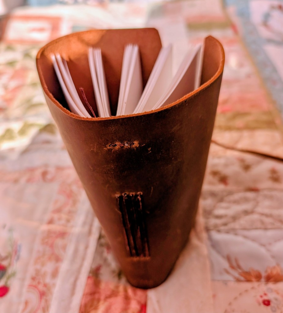 The company is called Lucas Ruth, they also sell ready-made ones if you don’t want to make your own. You could choose size, colour, personalisation and shape of tri-fold flap (straight, natural or curved as I chose). The box arrived quickly, it contained a roll of leather with my initials on and holes punched ready for the binding, some ready-threaded waxed thread, four sets of pages and a strap for wrapping round after.