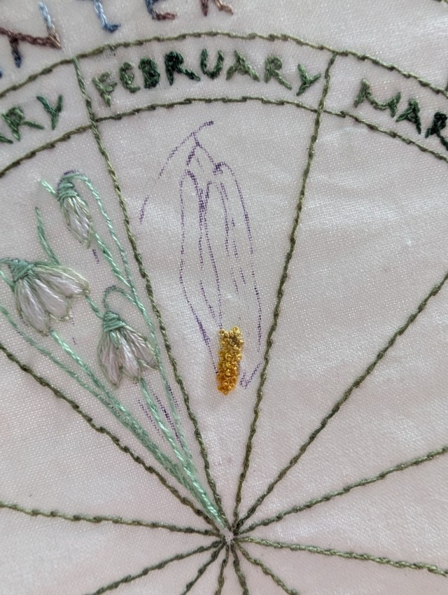 This year Skipton Stitchers are doing phenology wheels as a group project. I was delighted when this was suggested as I’ve been toying with the idea of stitching one for a couple of years. A phenology wheel is a circular visual nature journal, you can paint them, stitch them, create the picture however you wish. I’m stitching flowers and plants which are in the garden or on the back lane each month.