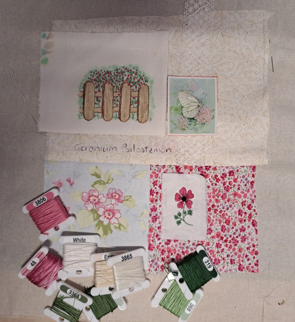 This one sits above the goldcrest one, once I’ve stitched the two blocks together I’m planning to do a bit more embroidery to link the two blocks together, so the buddleia and the roses will have stems which follow on to the block below.