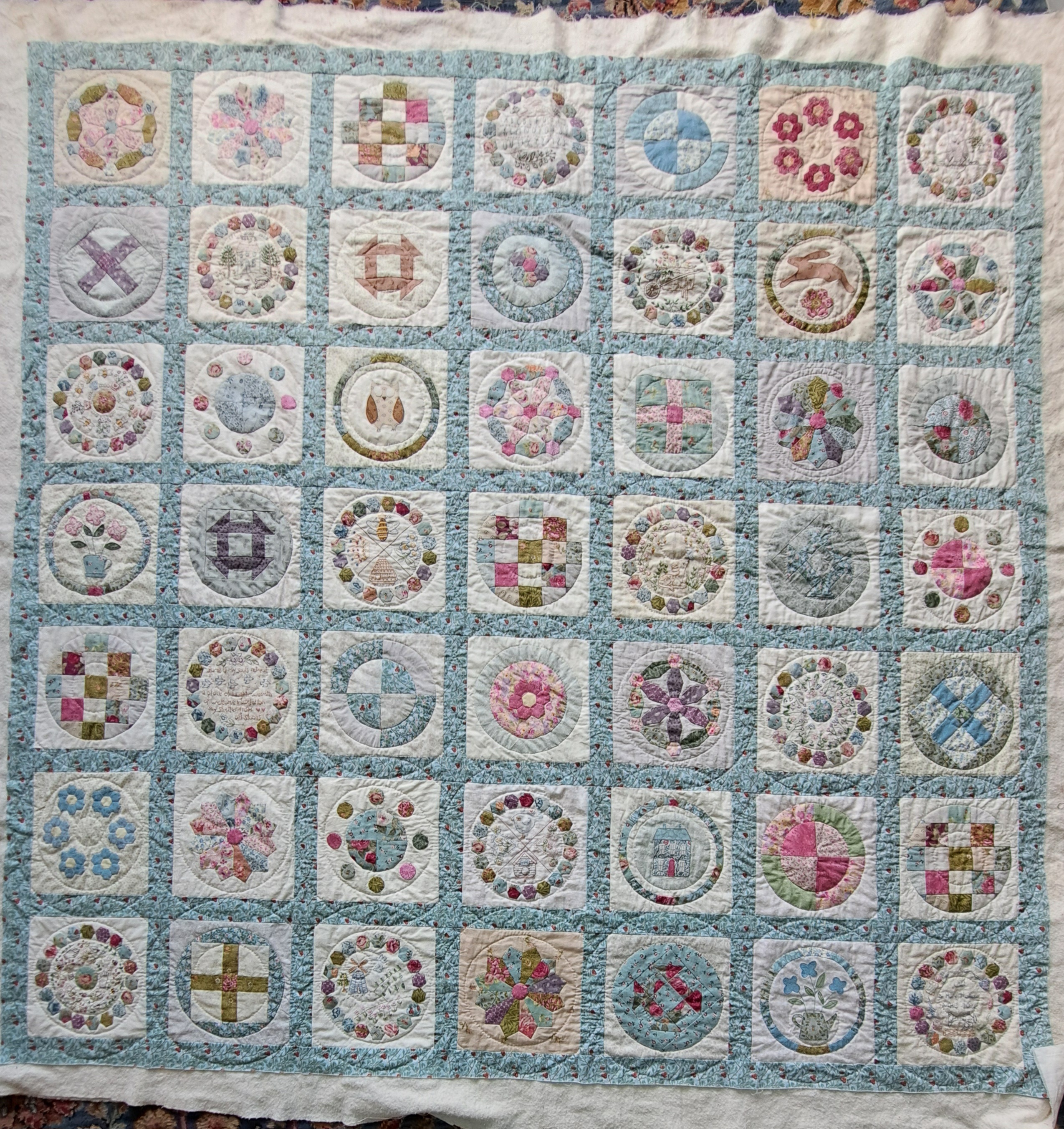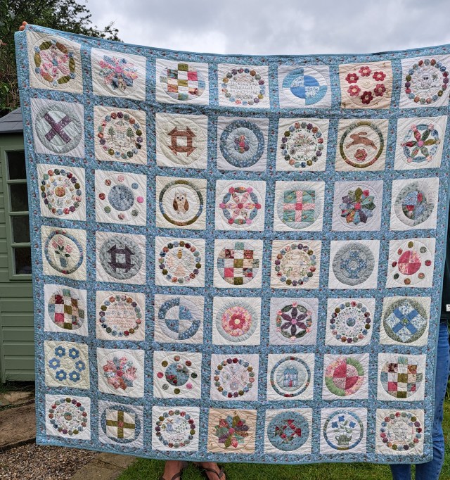 I machine stitched it to the front and then hand-stitched it to the back. Normally my last job would be to make a label, but I embroidered one as the final extra block, the quilt pattern was for a rectangular quilt 8×6 blocks without sashing, whereas I wanted a square quilt 7×7 blocks. Of course I could just embroidered 2025 and my initials on the back too for the final finishing date…I’ll see.