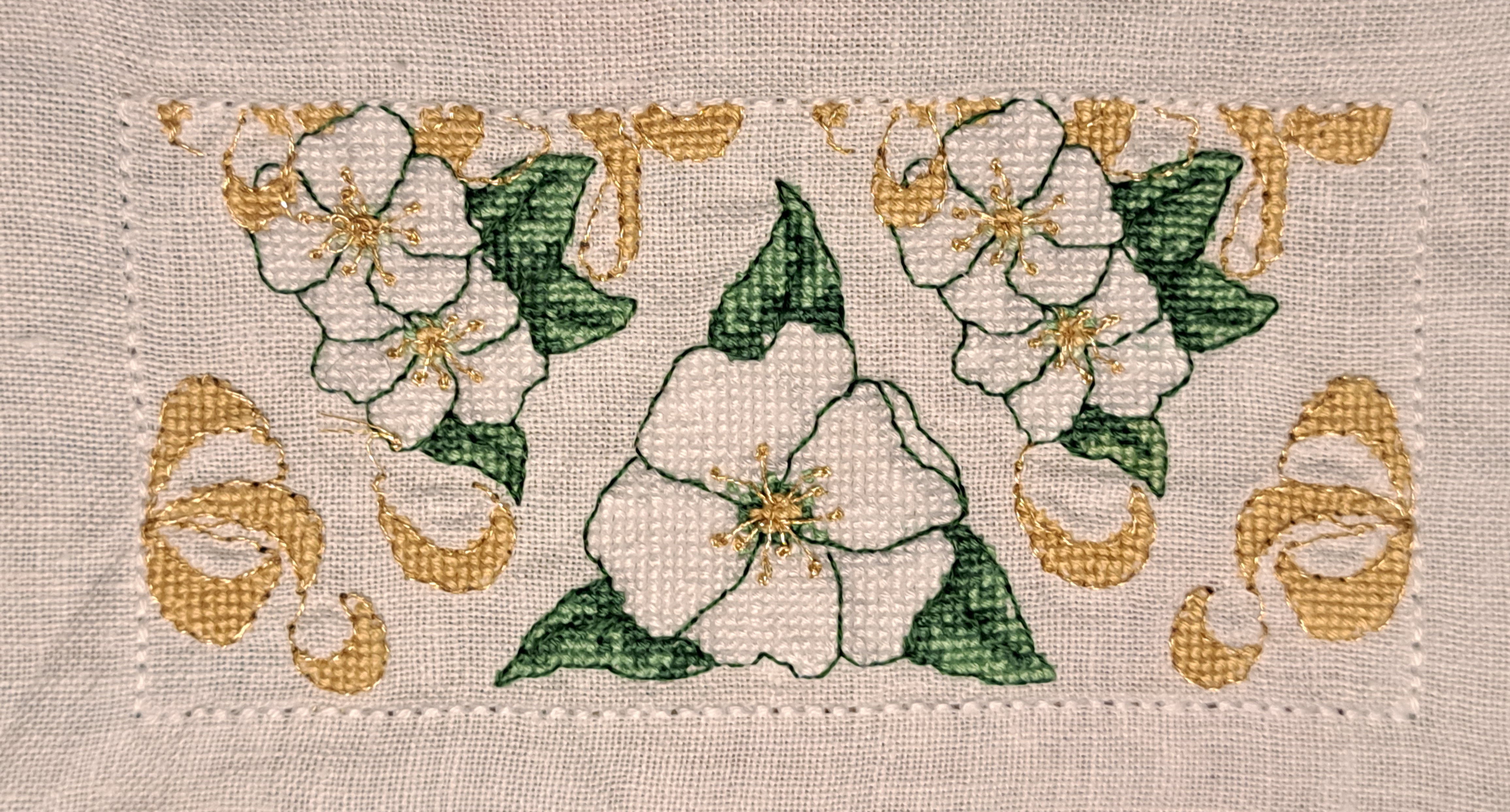 It was suggested that we do a joint project to celebrate and one member came up with the great idea of each of us stitching one or two small pieces in gold, 50 altogether, which could then be displayed at places such as Yarndale.