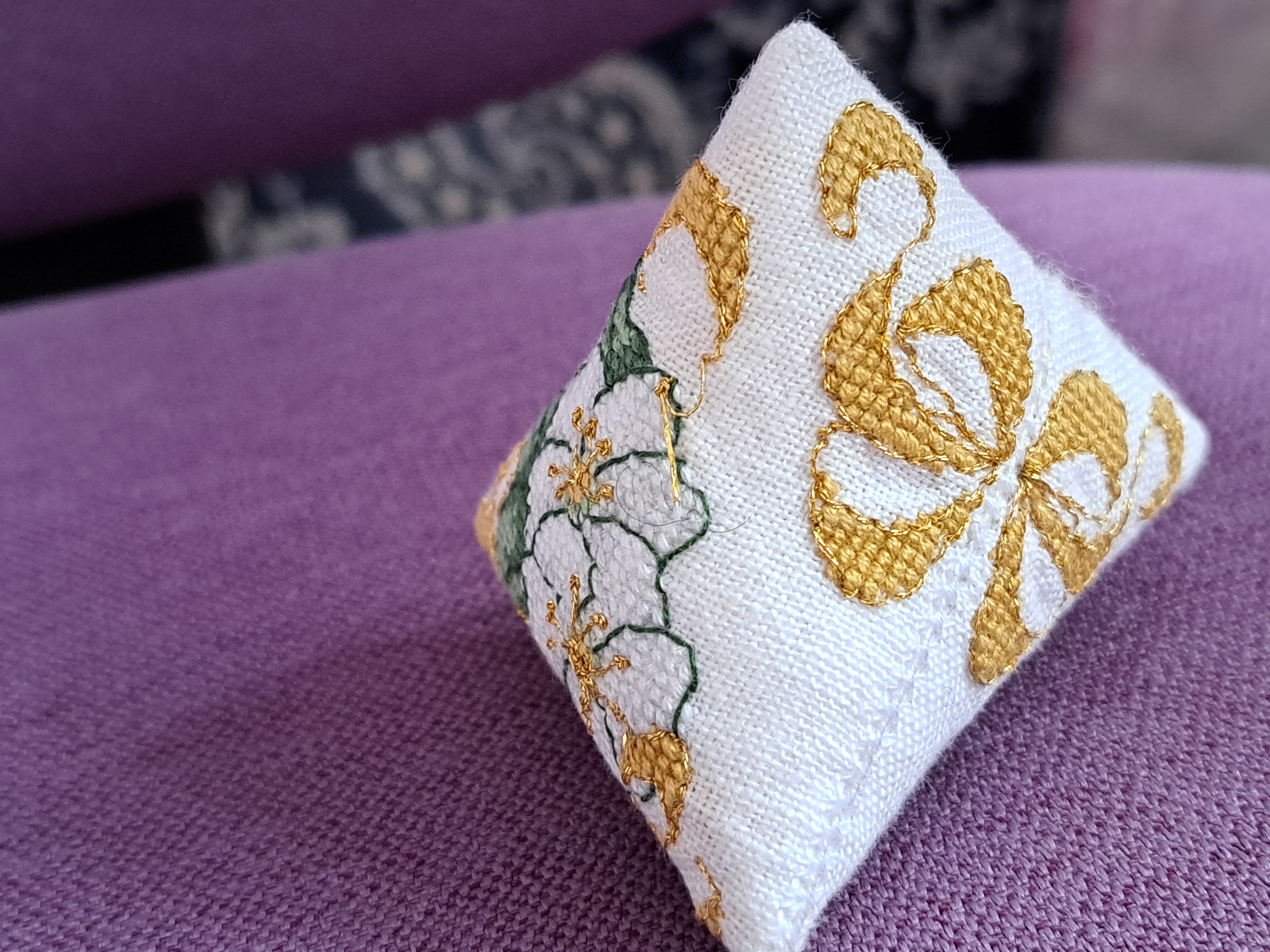 To make it into a humbug shape the two short sides are stitched together, using whip-stitch through the back-stitch. The top edges with the smaller roses are then stitched together making a square pocket with one open side. The bottom edge is then stitched so the centre line of the large rose and the seam with a bow on it come together, resulting in a humbug shape. Mathematically I believe it’s called a tetrahedron! …a pyramid!