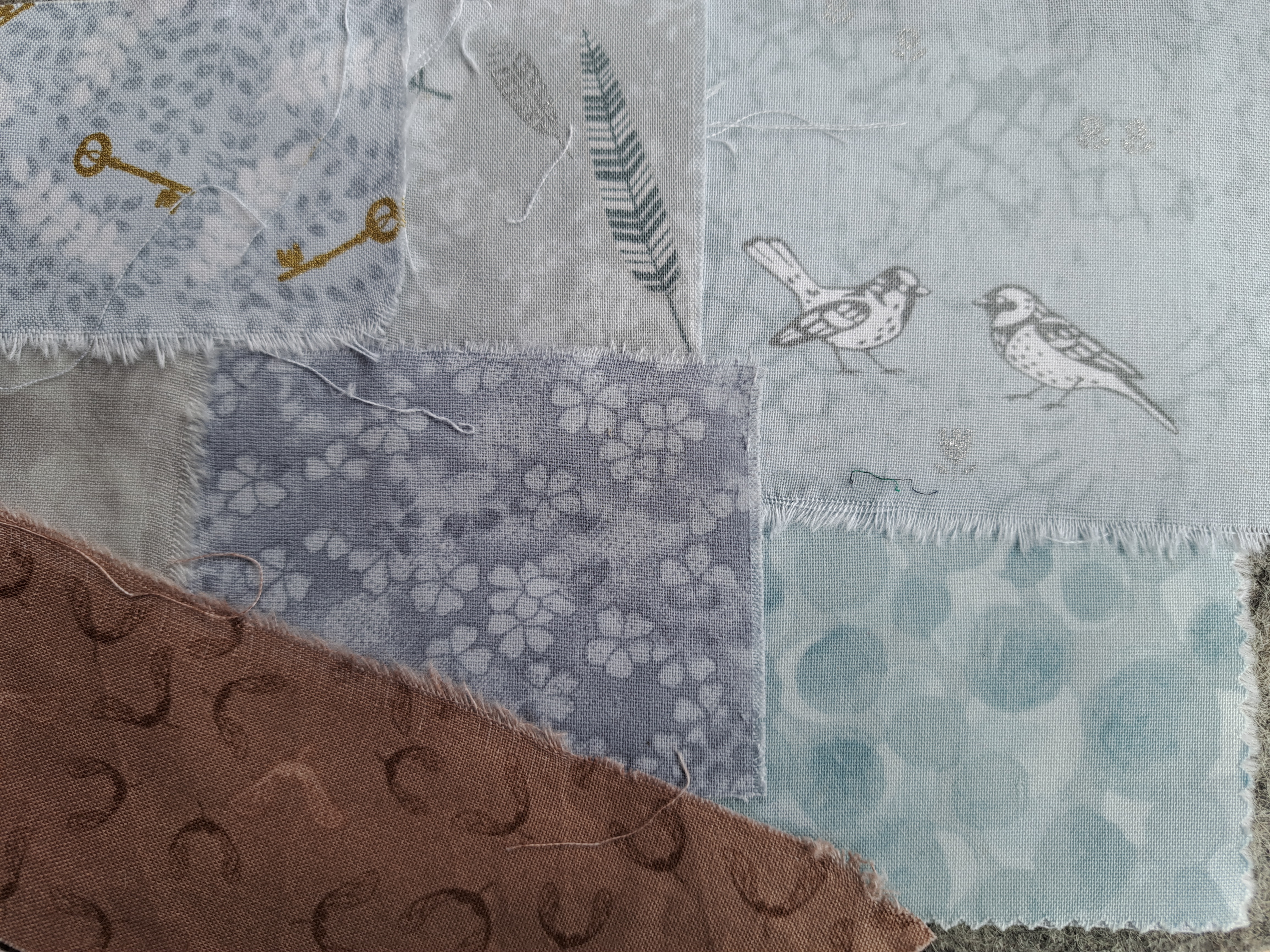 First of all I had to make a scrappy background, like Rebecca I used icy blue fabrics as it was a January design. I rather liked the idea of including the two birds on the print. This is my postcard once it was pressed down and stitched with tiny stitches. It was laid on some iron-on interfacing so it is firmly attached.