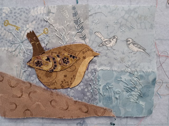 The wren is cut out from a whole piece, then the tail, wing and breast are overlaid. I actually chose the wing fabric first, then the body, tail and breast. I did wonder part way through embroidering if there was enough contrast between the wing and the body as it tones in a lot more now it’s stitched, but then I thought, well in reality it’s a little brown bird!