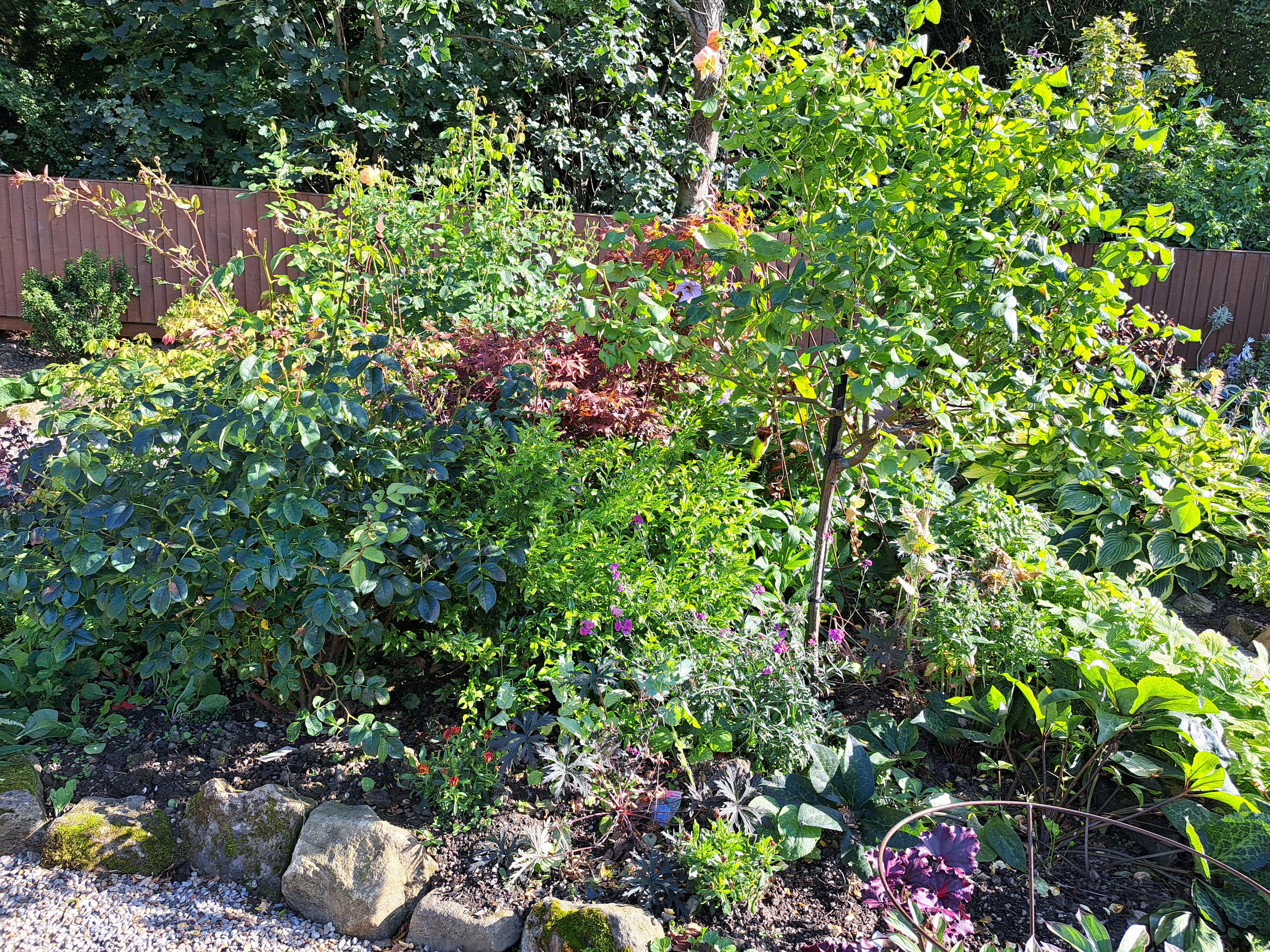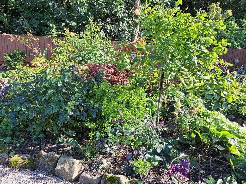 The plant who seems to be wilting the most is actually one of the standard roses but having had to dig down to be able to hammer in a stout steel stake to support it, I can see why. Even 8″ down it’s as dry as a bone and being clay it’s like concrete. I’m currently trying to give it a watering can full each evening until it starts to look a little happier. It certainly looks happier with the new stake, it’s now standing tall and proud!