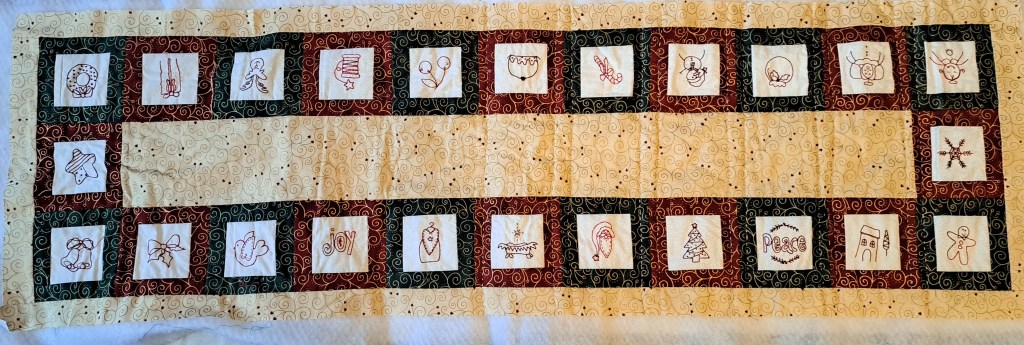 I’d started quilting it with perle thread but I couldn’t find the same colour so I’m using two threads of DMC which seems to be looking very similar. It’s very simple quilting with just straight lines across and then along the runner.