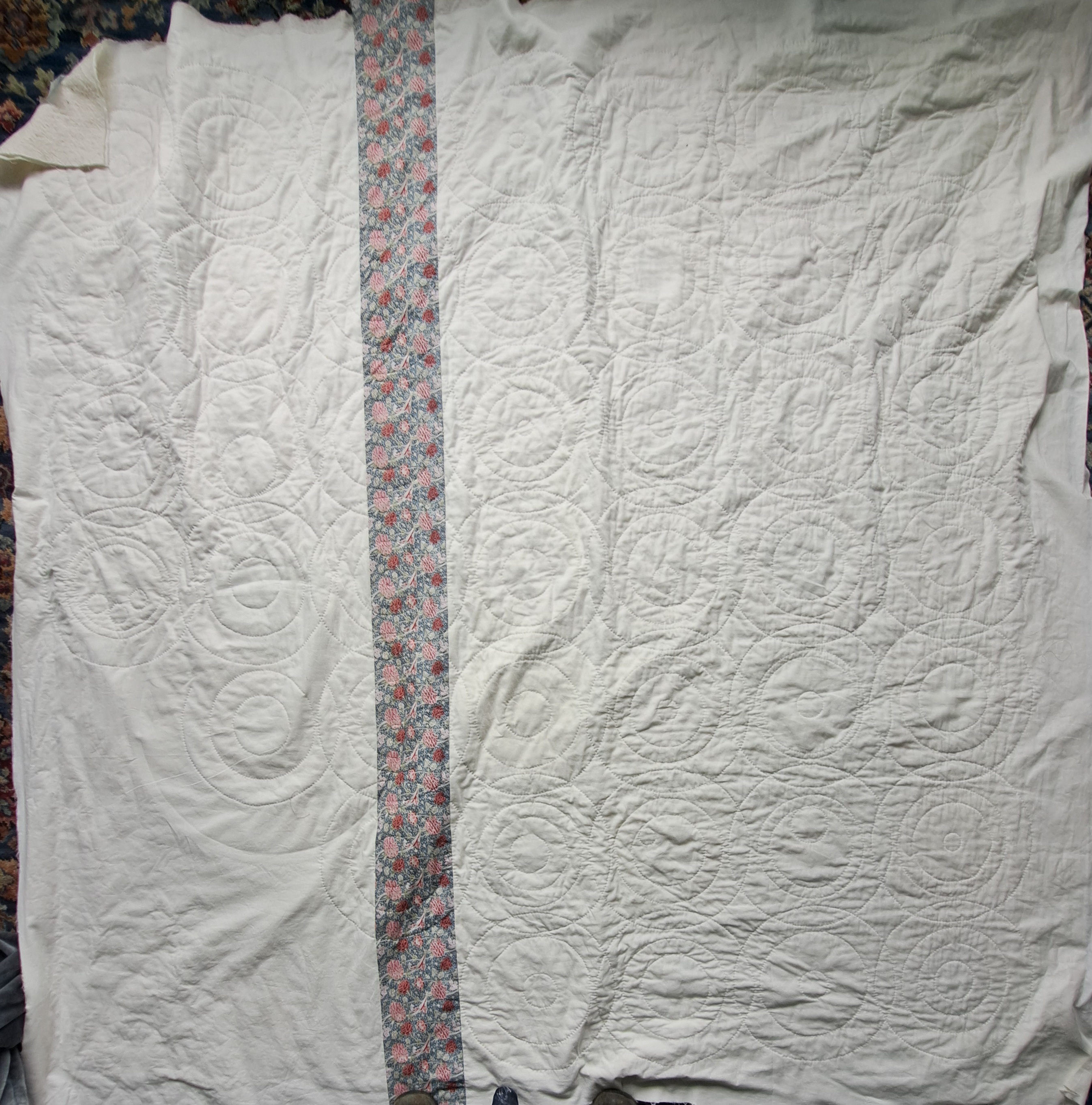 All I have to do now is trim the edges, stitch on the binding and hand stitch it down and then it will go in the wash! I don’t wash them immediately generally but having had all the building work done over the last few months I’m sure it’s grubbier than it looks.