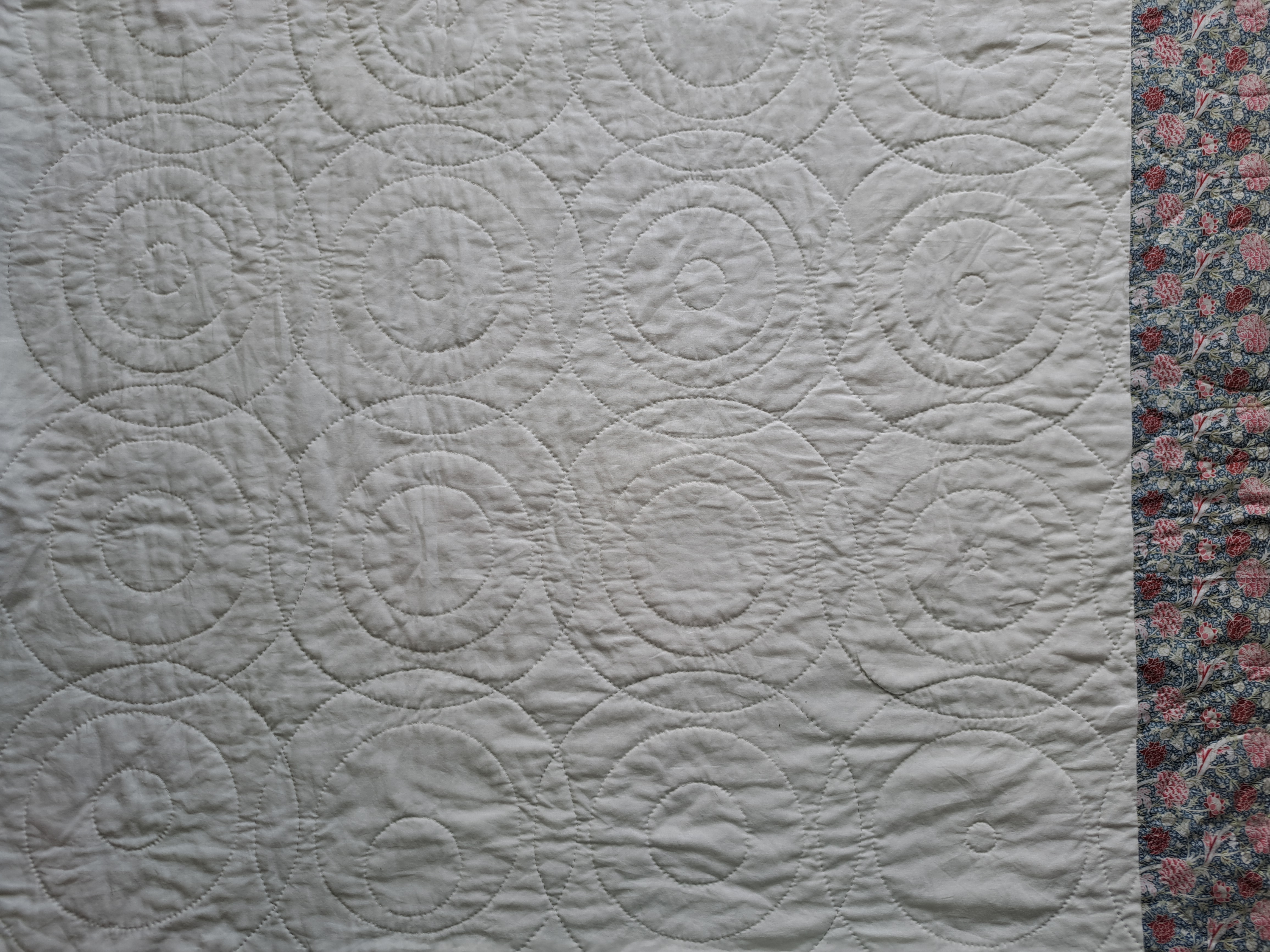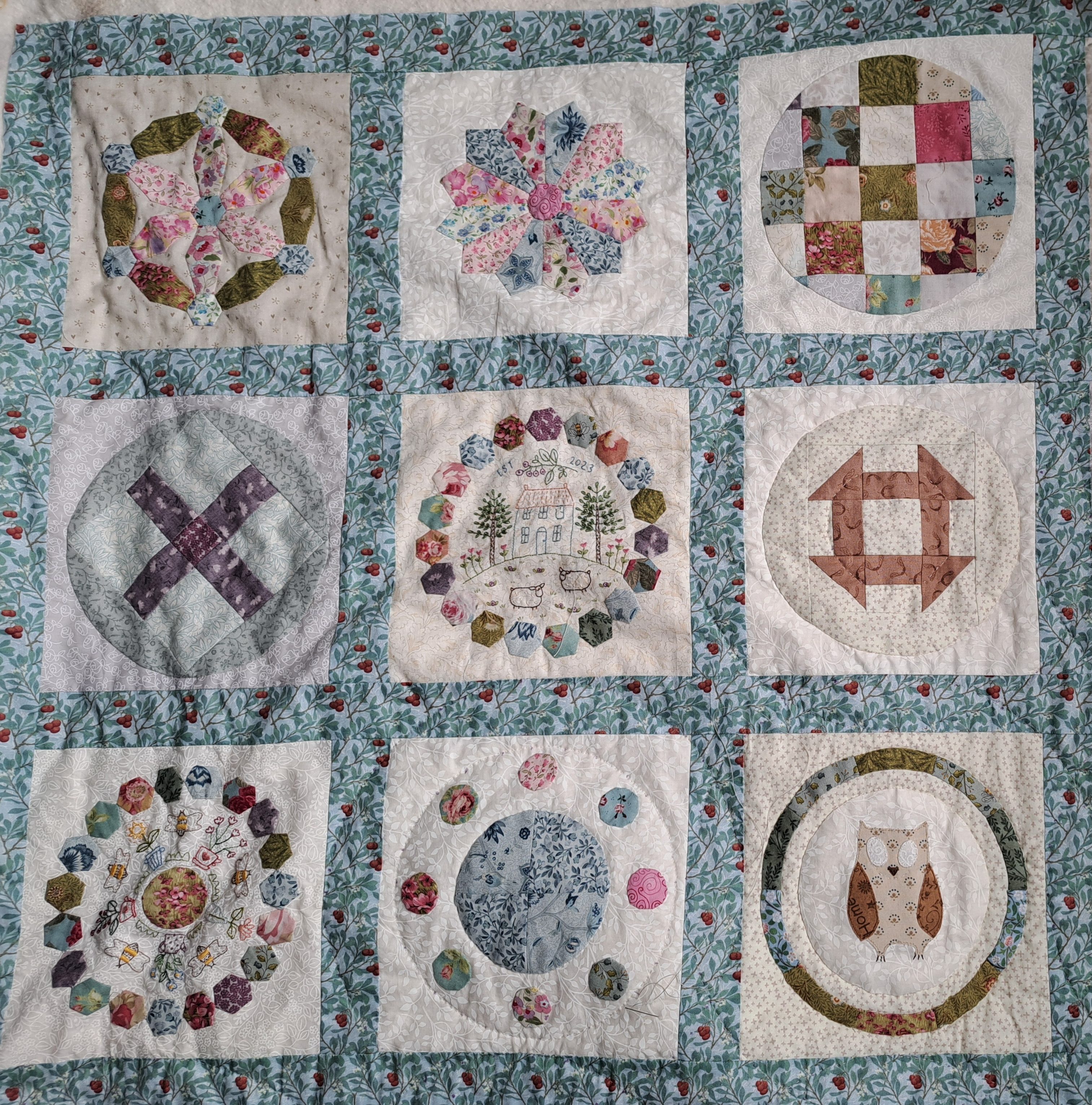 I finished quilting the fiddly corner and edge blocks a couple of nights ago. I’m really pleased with how the different sized circles and the larger interlocking circles have worked out. I just have to remember to stitch little buttons on for the owl eyes on a couple of blocks.