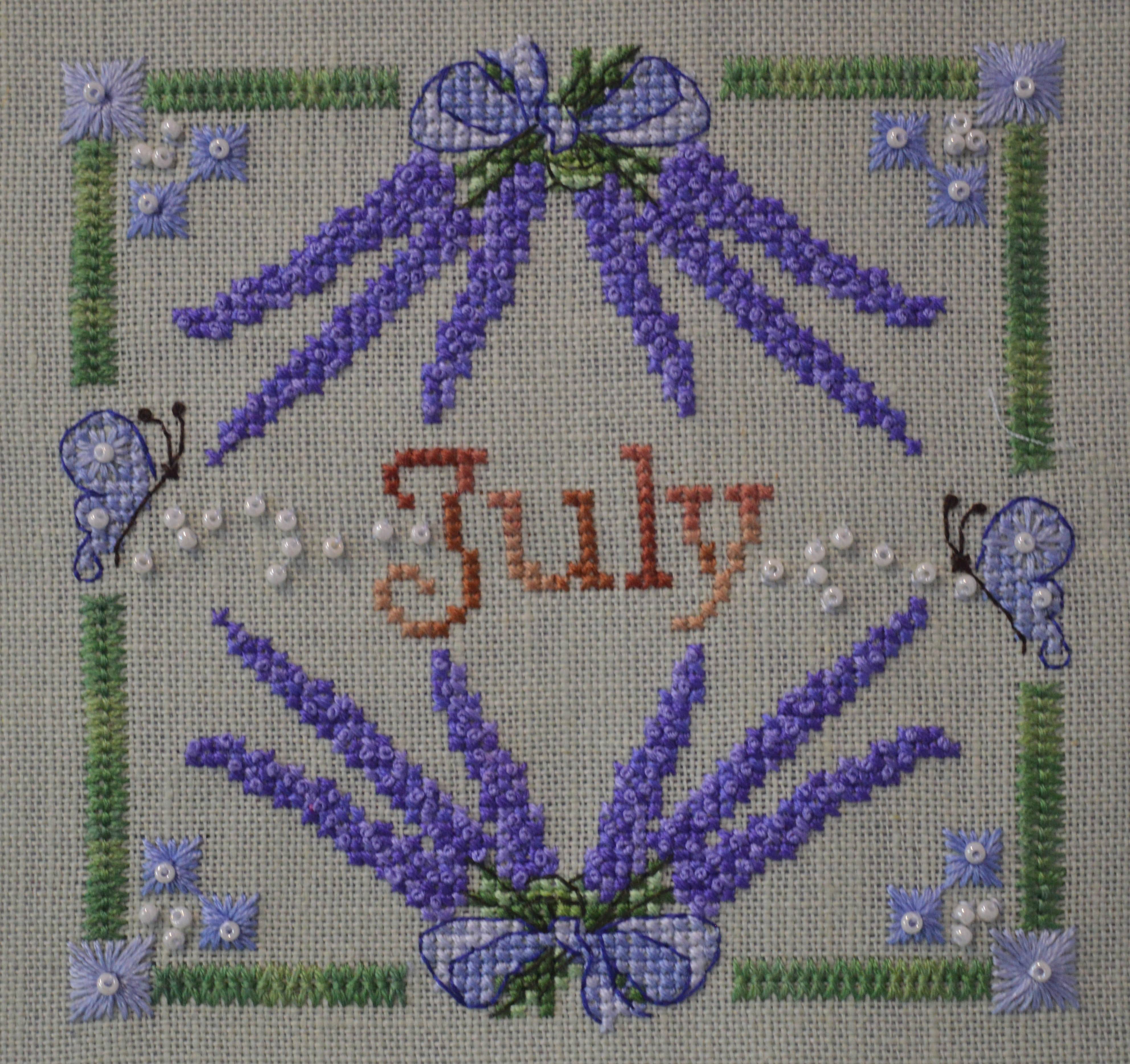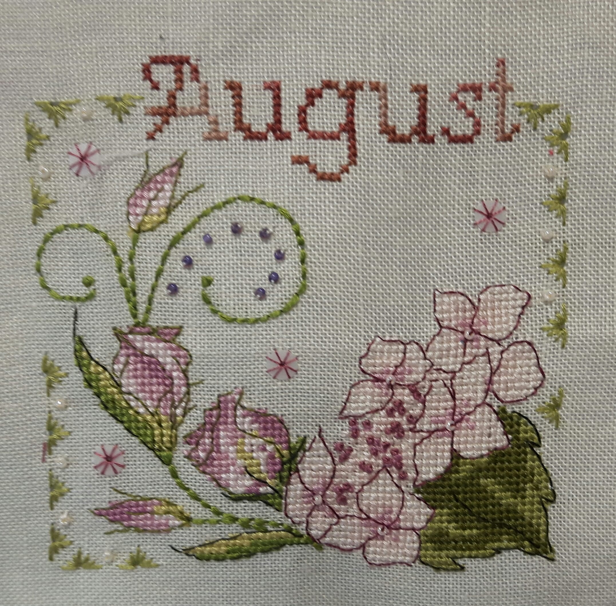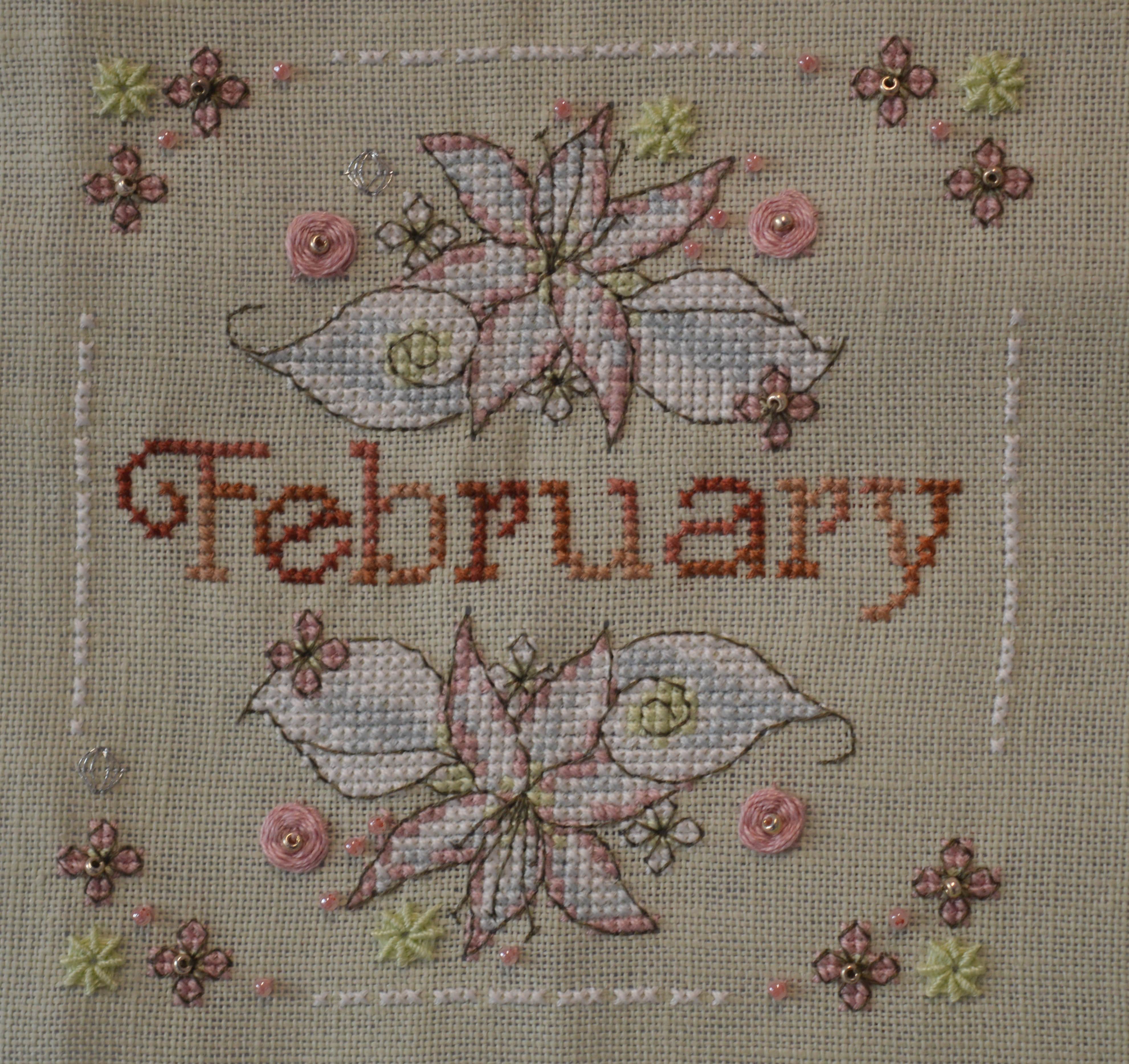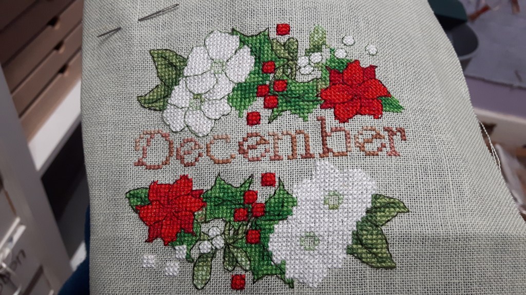 This morning I put the last few stitches in ‘December’ for the Anthea Calendar, this is the last one in the series of twelve beautiful flower designs by Faby Reilly. It’s been fun trying to guess what the seasonal flower would be each month (not very successfully!) and this month I got it three-quarters right!