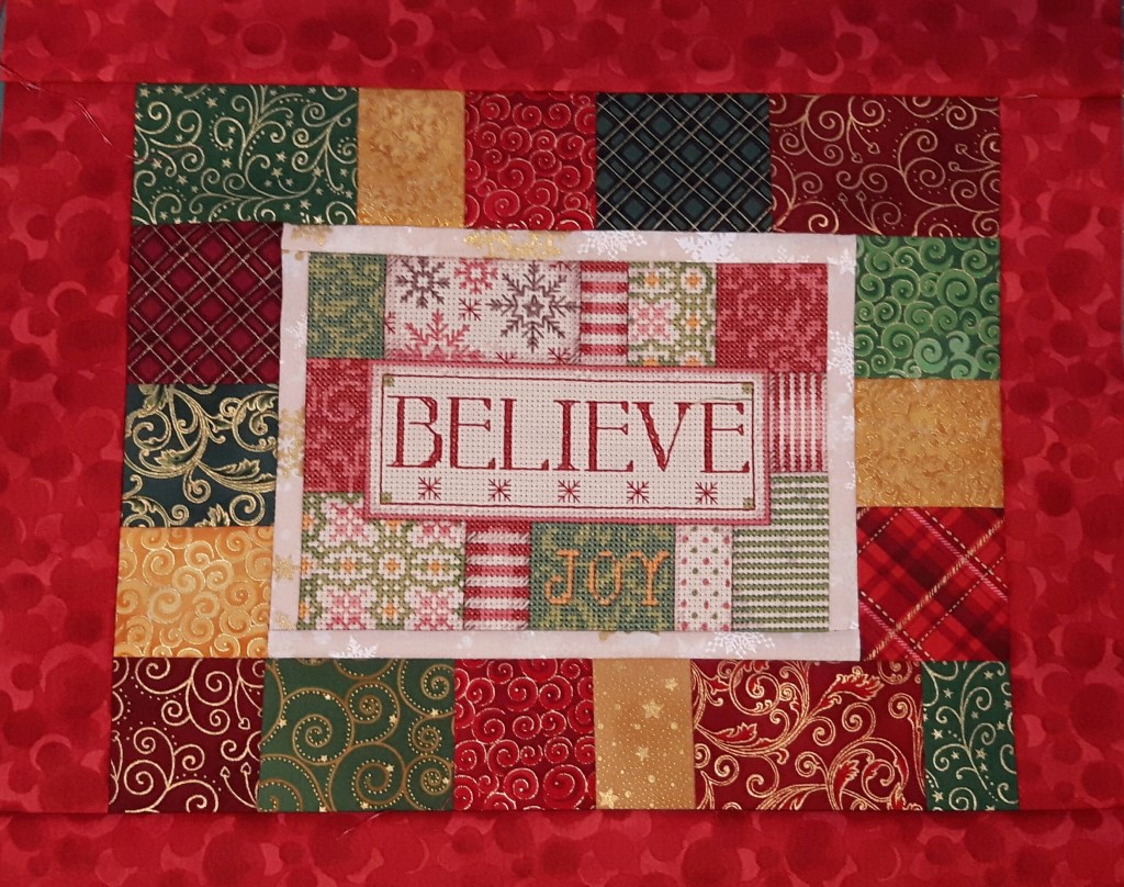 I’m on a bit of a roll at the moment, finishing various projects. In the autumn I stitched a Dimensions cross-stitch kit called Believe, the stitched border was like a patchwork quilt, at the time I was mulling over how to finish it…