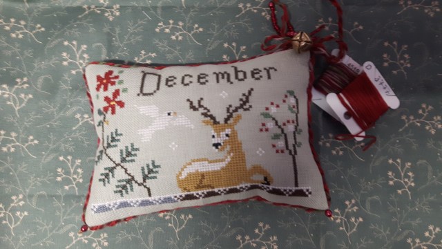 The December small was only finished last month, about two years after I stitched the first ten months! The dachshund was a present for my daughter, she was rather keen on them at the time. The little gingerbread house was a kit from Nutmeg Designs in Reeth, I stitched it quite a few years ago. I think the mistletoe was a kit from Hobbycraft, it was originally hung on a card for my OH.
