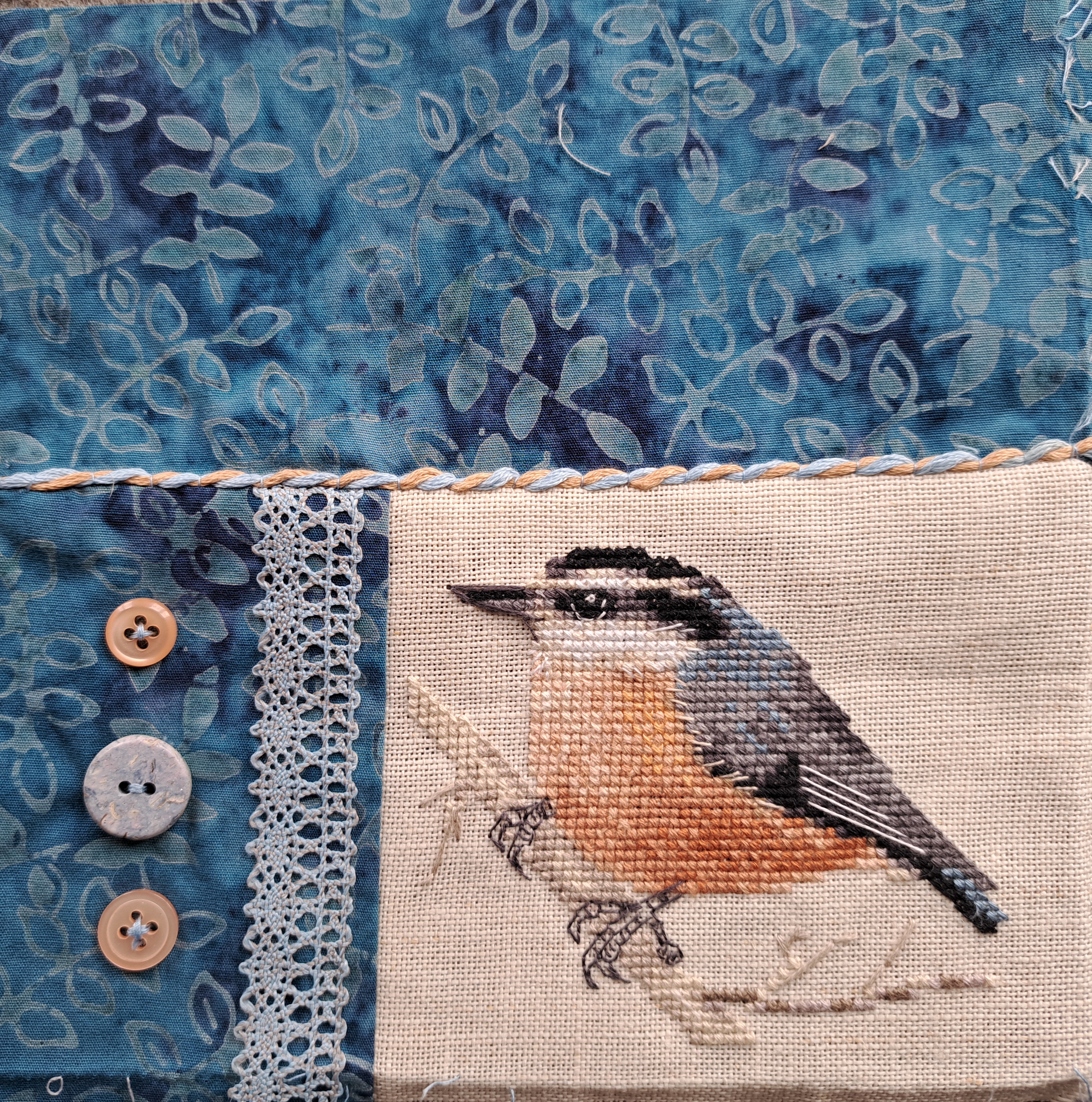 After the kookaburra is a blackbird print from some dress-making fabric I’ve earmarked for a shirt which colour-wise picked up the colours of the cross-stitch nuthatch nicely. This one is also a former mini-cushion…