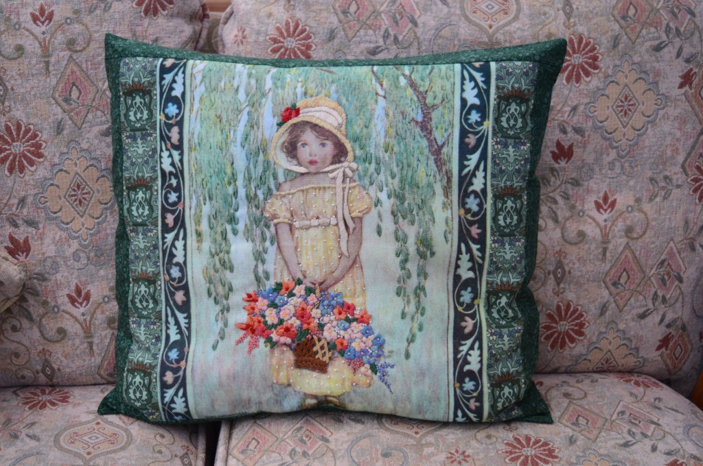 I found some green quilting cotton in my stash and played around a bit with trims before I finally decided on the narrow ivory lace and the beige tape. Having stitched it together and stuffed it I felt it needed something else. I tried some buttons in the corners but that didn’t work, so they got unpicked.